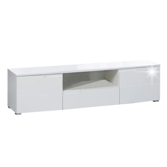 Comodă TV SPICE, Material: PAL melaminat Finisaj: alb extra lucios HG Dimensiuni (lxhxA): 165x42x40 cm Grosime material: 16 mm 3 uşi Spaţiu de depozitare deschis