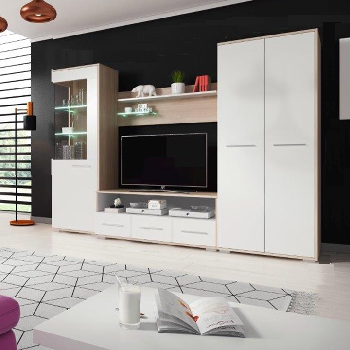 Dulap living FREDO Material: DTD laminate / ABS muchii Culoare: Sonoma de stejar / mat alb Dimensiuni (LxGxÎ): 275x56x190 cm Furnizat în demont